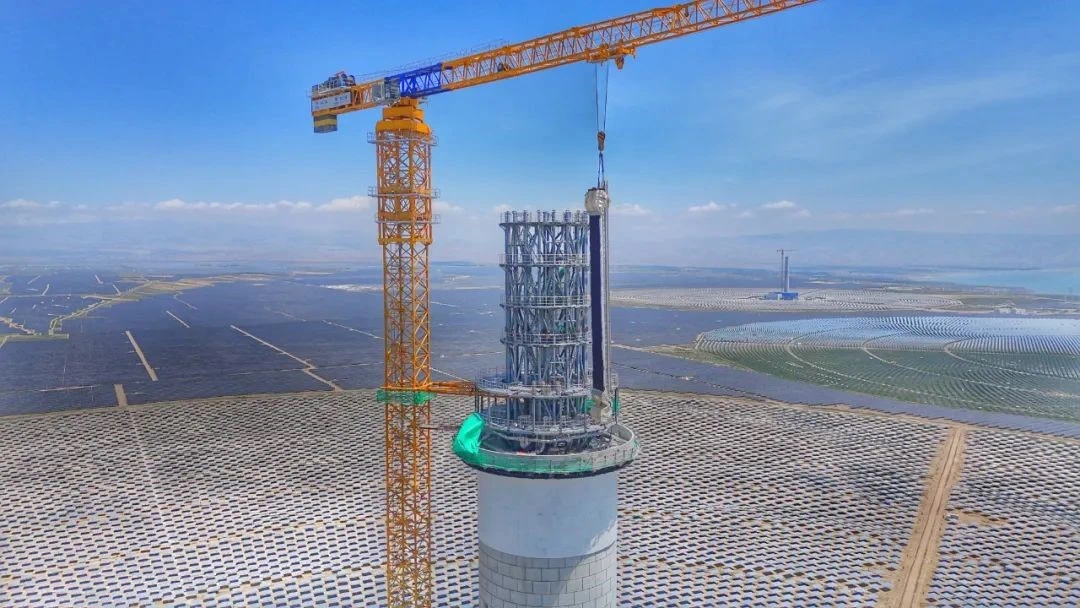 7月15日,北京巴威首個(gè)塔式太陽(yáng)能光熱發(fā)電項(xiàng)目——國(guó)能青豫直流二期100MW光熱項(xiàng)目取得關(guān)鍵進(jìn)展:首片熔鹽吸熱器管屏順利完成吊裝。